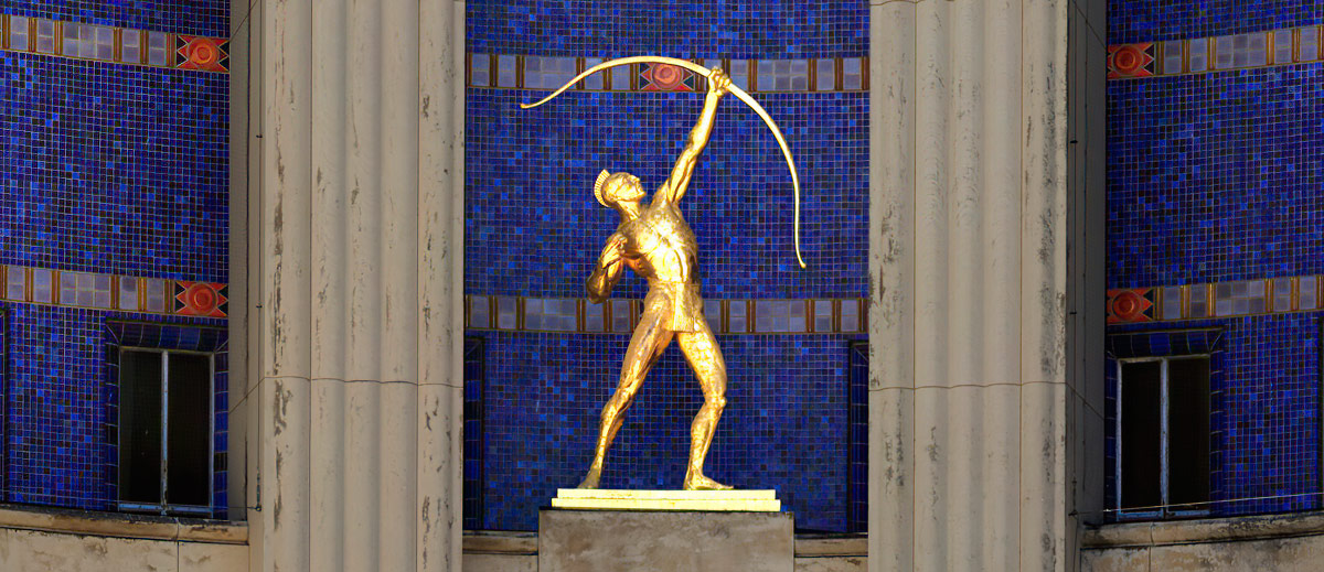 Dallas Fair Park, Texas, created in 1886 and home to the 1936 Texas Centennial Exposition and serves as an Art Deco showcase. Ultra high resolution showcasing all the details of the golden archer.Notes (Dallas Fair Park Photography):