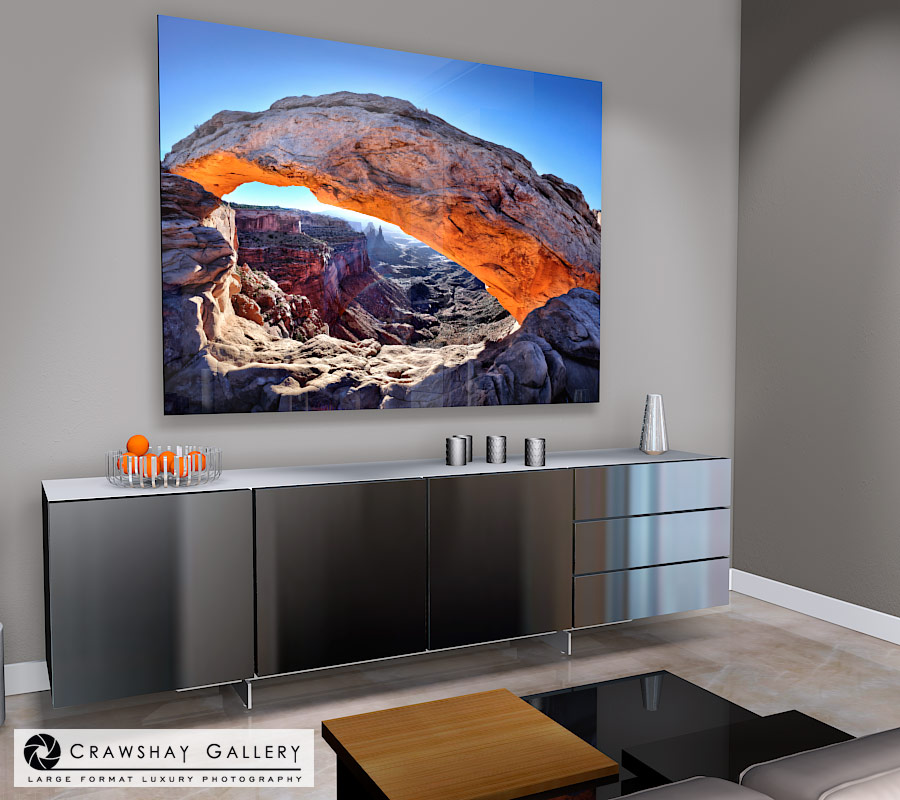 This large format fine art panoramic photograph captures the natural beauty of Mesa Arch at sunrise in Canyonlands National Park, Utah. The photograph showcases the iconic arch which is a natural rock formation carved by water erosion over millions of years. The photograph is taken at the perfect time, highlighting the warm tones of the sunrise illuminating the red rock of the arch and the surrounding landscape, creating a dynamic and visually striking image. The photograph provides a wide-angle view of the entire arch, the surrounding rock formations, the canyons and the desert landscape, providing a sense of context to the image. The photograph can be mounted on acrylic, providing a modern and sleek look and a 3D effect that makes the photograph appear as if it is floating off the wall. The acrylic mount also provides protection to the photograph, ensuring that it will last for years to come. This photograph is perfect for those who love natural beauty, it will make a great addition to any home or office and will be a true conversation starter.Notes (Alternative Mesa Arch Angle):